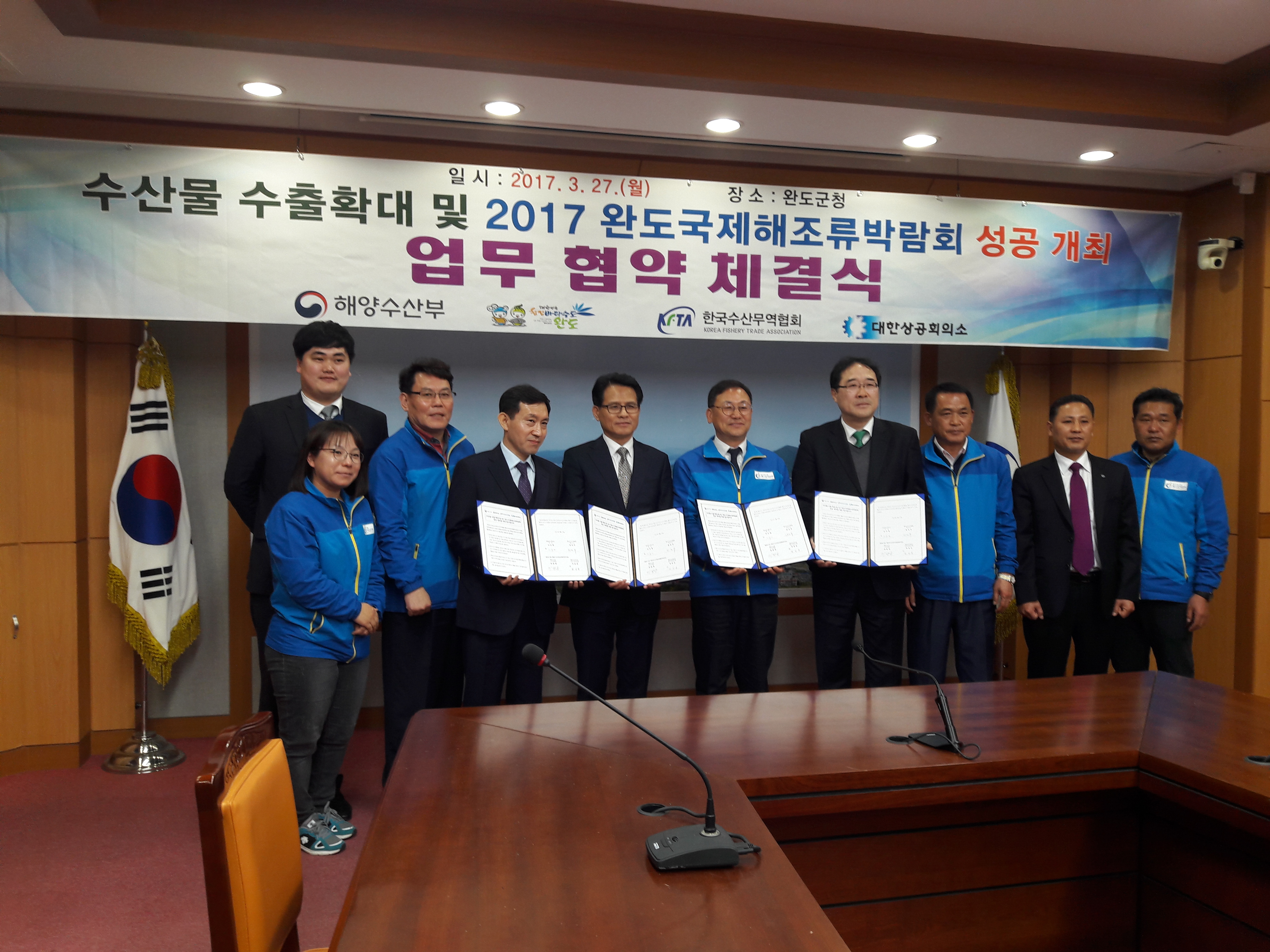 한국수산무역협회는 지난 3월27일 수산물 수출확대 및 2017 완도국제해조류박람회의 성공개최를 위한 협회, 완도군, 상생협력단과의 업무협약을 체결하였습니다.